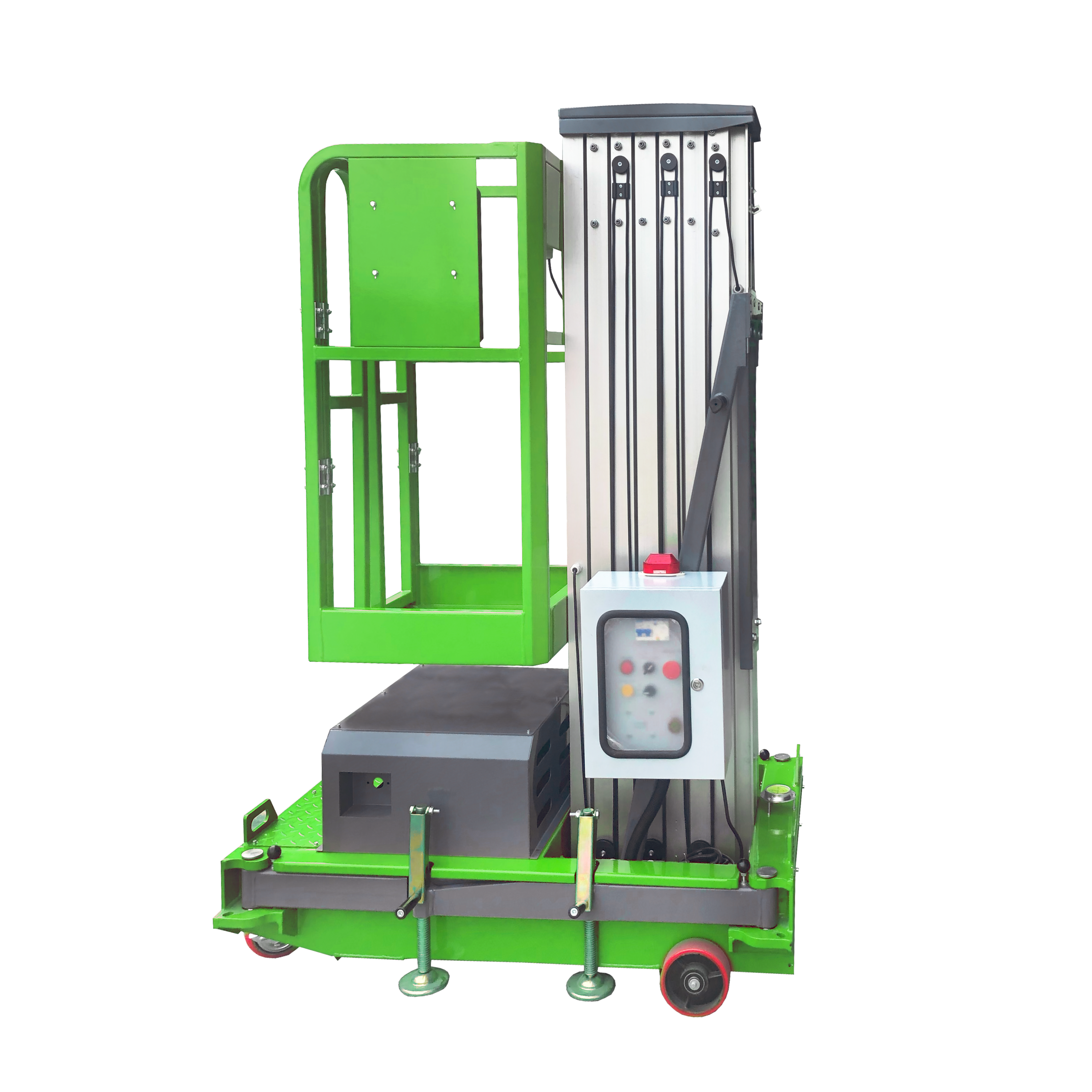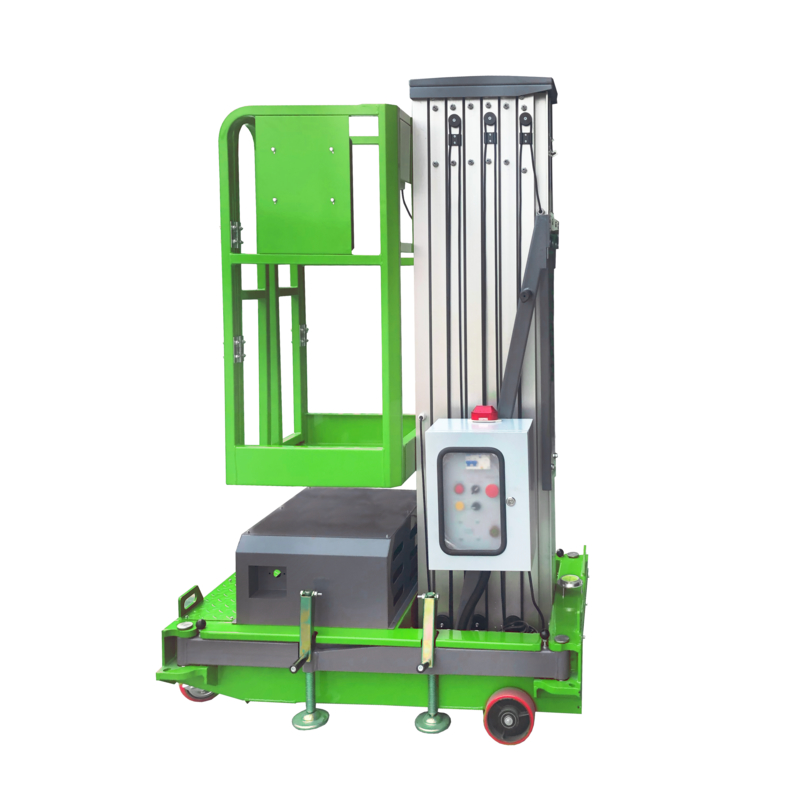 Eigenschappen niet-merkt banden en geanodiseerde aluminiummast. Rond gemakkelijk geduwd aan de aangewezen plaatsen, mooie structuur, compact hoofdlichaam, steek gewogen aan, veilig en betrouwbaar. Het wordt in werking gesteld door de telescopische cilinder die het sterke en betrouwbare werken is en de controleborden op de de liftplatforms en grond beschikbaar zijn.